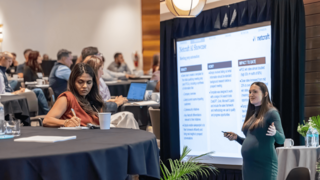 Attendees take notes; Emily Fox presents Spectrum's AI Survey Readout